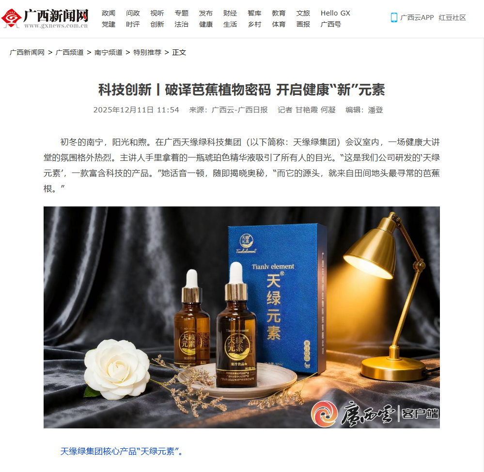 近日,广西权威媒体“广西云-广西日报”以《破译芭蕉植物密码 开启健康“新”元素》为题,对广西江南(中国)科技集团进行深度报道,全景式展现了寻常芭蕉根,如何通过科技创新蜕变为守护健康的“江南全站元素”全过程。这不仅是对江南(中国)科研实力的认可,更是对我们所践行的“科技惠农”产业模式的生动诠释。